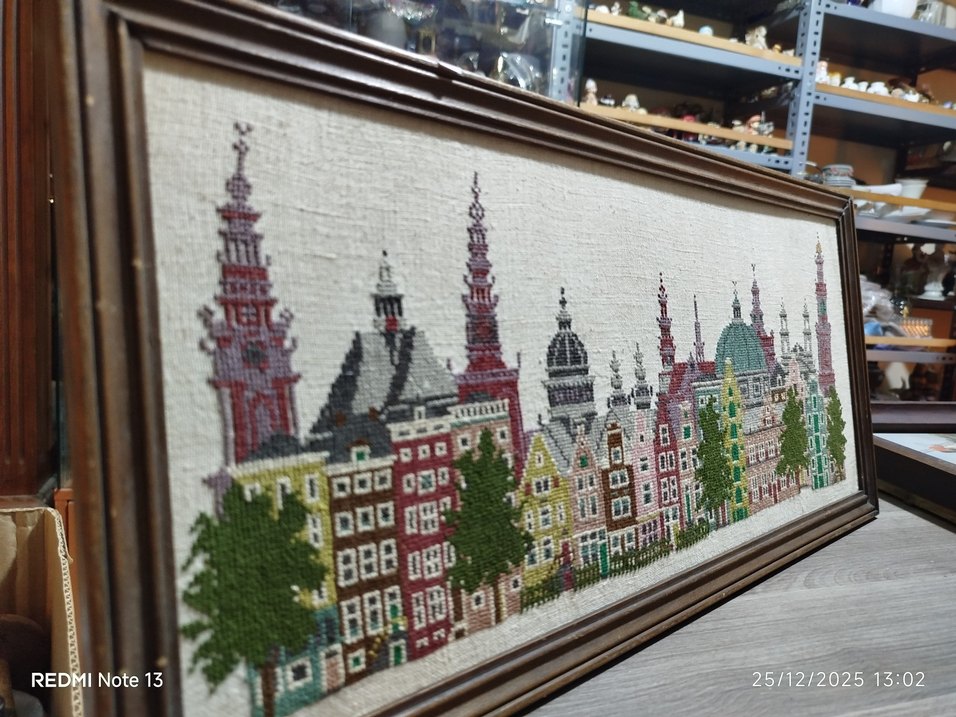 Çerçeveli, koyu tonlu çok renkli nakışta detaylı bina ve ağaçlarla şehir manzarası yer alıyor. ️