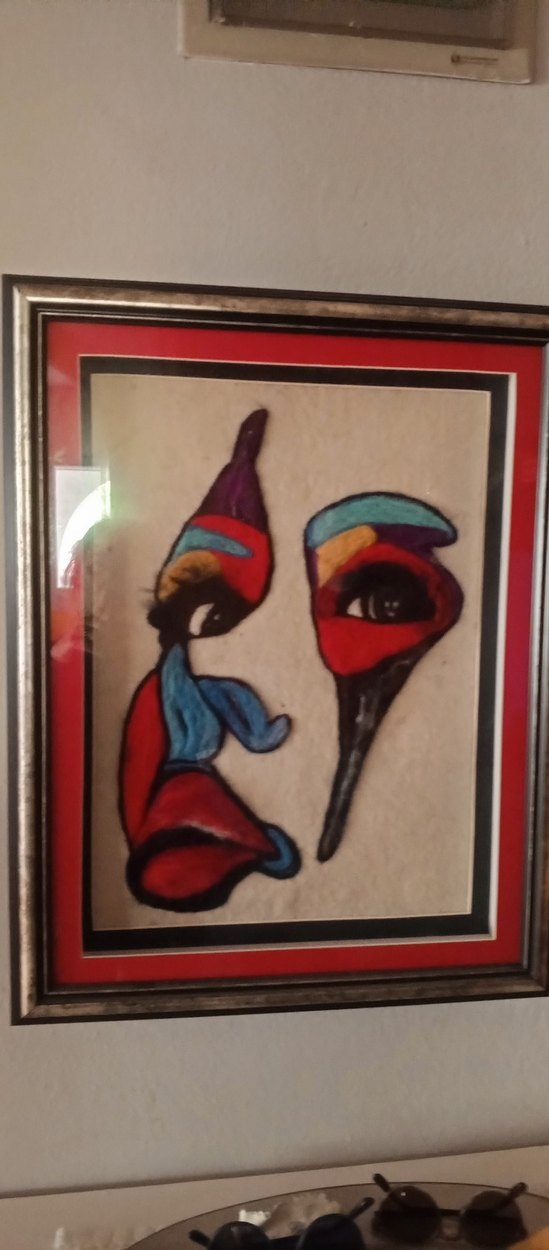 Çerçeveli, koyu ve canlı çok renkli soyut yüz figürlü tablo. Kırmızı, mavi ve morun etkileyici birleşimiyle dikkat çekiyor.