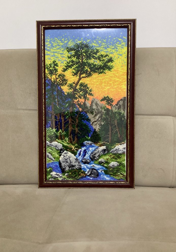 Çerçeveli bu tablo, akan nehir, ağaçlar ve renkli günbatımı gökyüzüyle canlı bir doğa manzarası sunar. Koyu ve çok renkli paleti tabloya derinlik katar. ️32*54