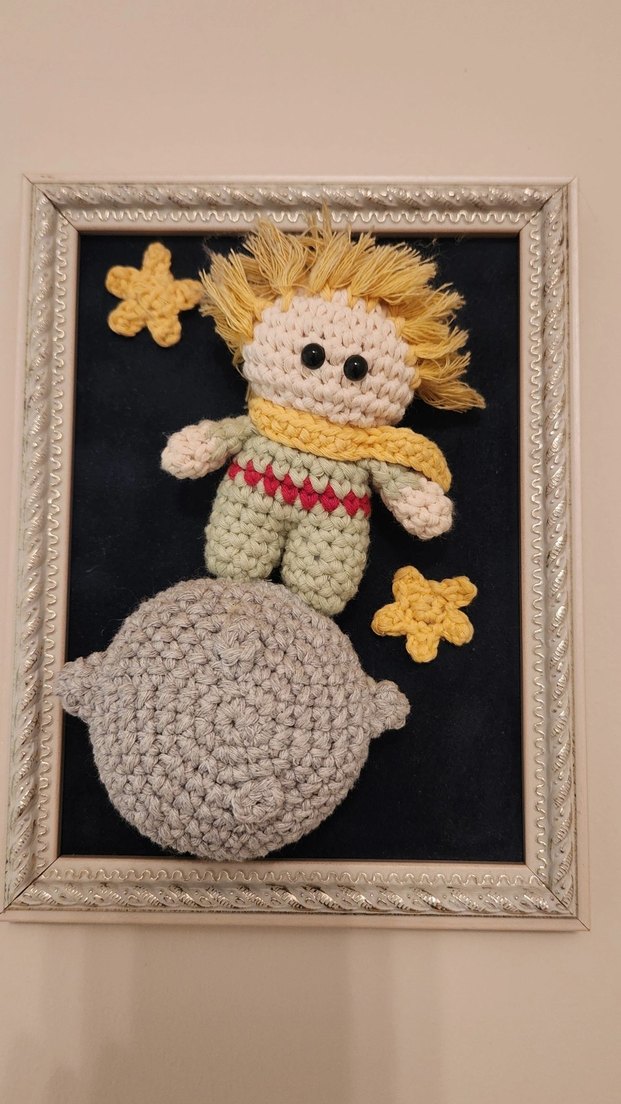 El yapımı, 3 boyutlu örgü Küçük Prens temalı bebek, gri - mavi gezegen ve sarı yıldızlarla süslenmiş çerçeve içerisinde duvar aksesuarıdır. Yumuşak iplikten, detaylı işçilikle özel yapılmış tasarım üründür.