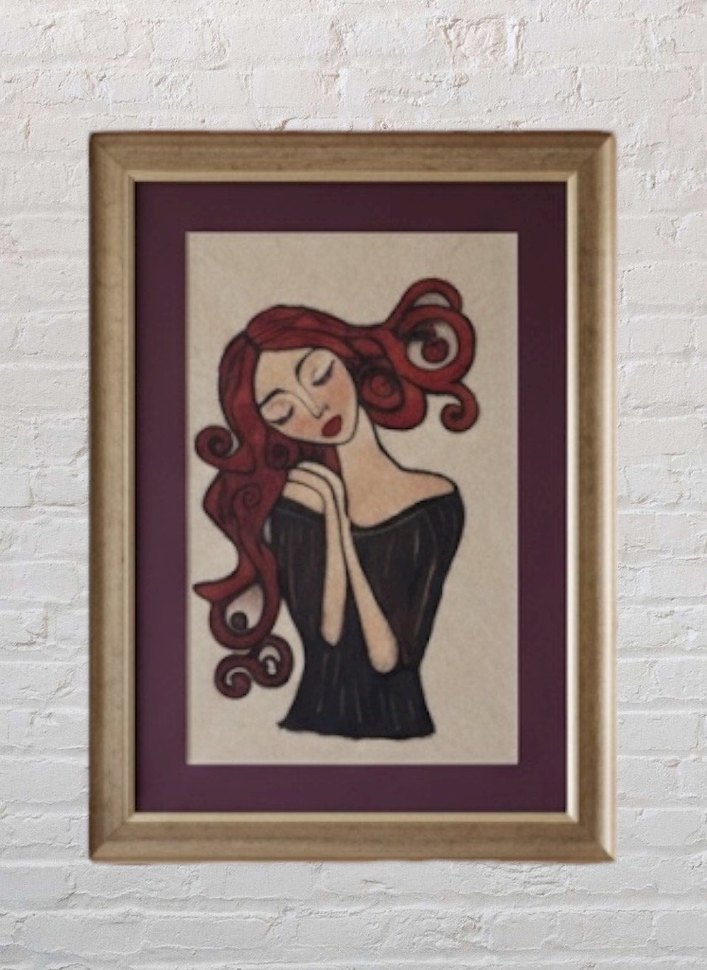Bordo paspartulu ve açık renk çerçeveli, bordo saçlı kadın figürlü tablo.