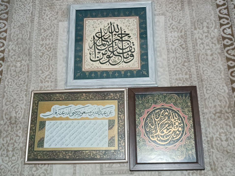 Koyu tonlarda İslami hat sanatını gösteren, çerçeveli ve detaylı desenli üç tablo seti. Canlı renkli zeminlerde Arapça yazılar yer alır. ️