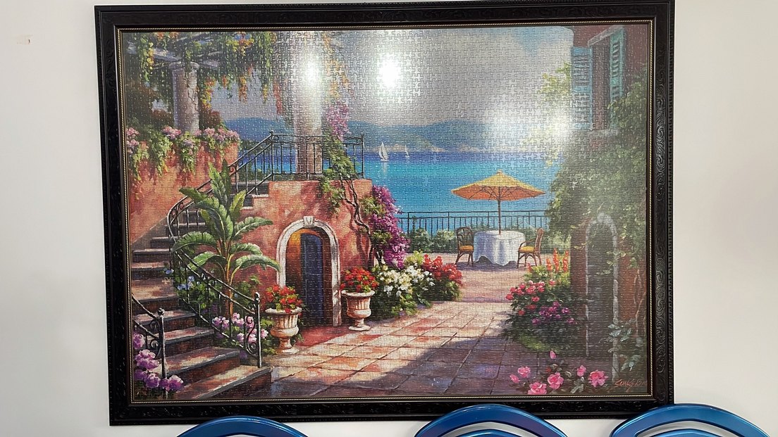 Çiçekler, şemsiye ve uzaktaki yelkenlilerle sakin bir deniz terasını gösteren çok renkli puzzle.