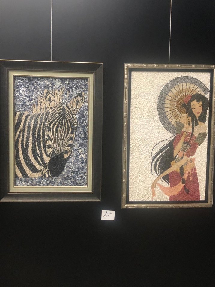 Çerçeveli zebra ve şemsiye tutan kadın figürlü tablolar. Koyu ve çok renkli tonlarla canlı görseller oluşturuyor. ️yenı cervelı 1 adat dıyatı camdıt