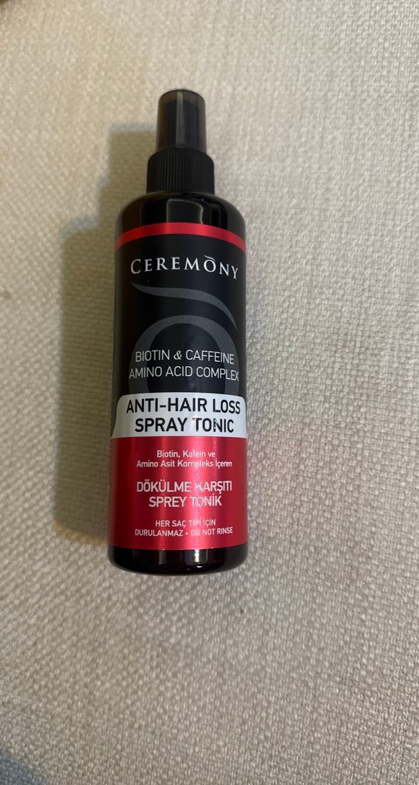 Ceremony dökülme karşıtı sprey tonik, biotin, kafein ve amino asit kompleksi içerir. Durulama gerektirmeden kullanılır. ♂️