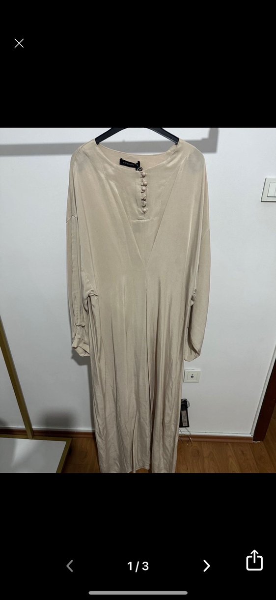 Uzun, düğmeli, bej elbise. Uzun kollu ve bol kesim, ipeksi dokuda, sade ve günlük kullanım için uygun. Yeni sayılır 1 kere giydim