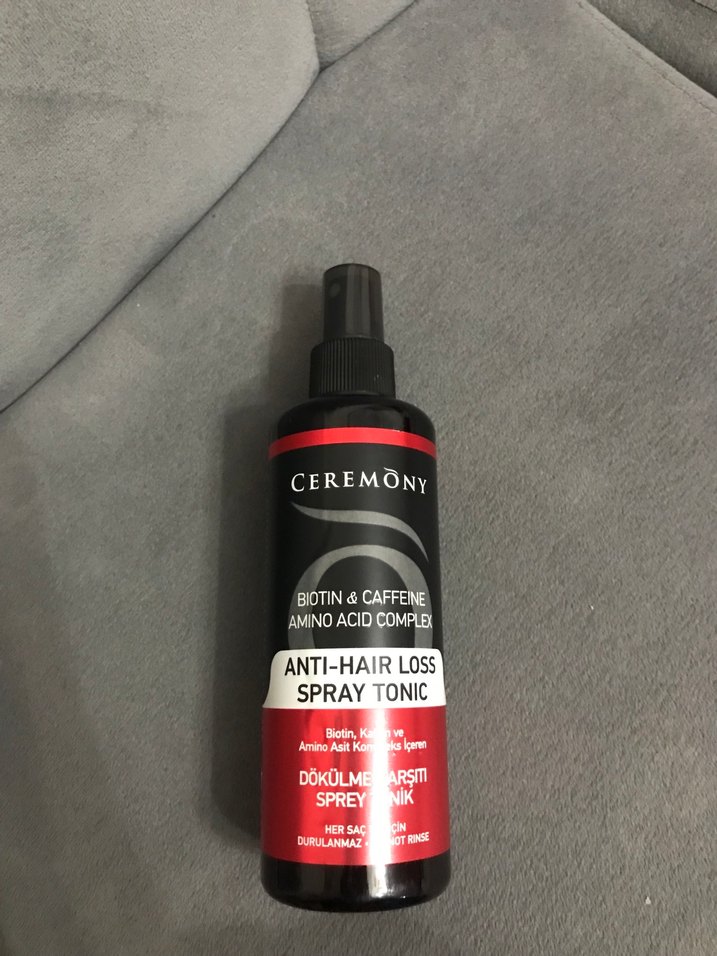 Ceremony saç dökülmesine karşı sprey tonik, biotin, kafein ve amino asit kompleksi içerir, durulanmadan kullanılır.