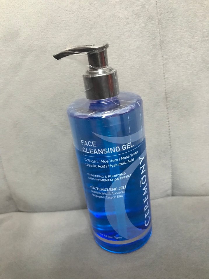 Ceremony yüz temizleme jeli, kolajen, aloe vera, gül suyu, glikolik asit ve hyaluronik asit içerir. Nemlendirir, arındırır ve leke görünümünü azaltmaya yardımcı olur. Tüm cilt tiplerine uygun.