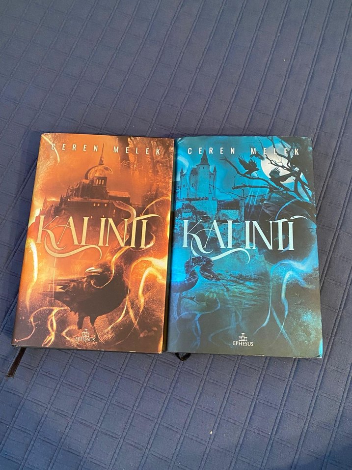 Ceren Melek'in yazdığı 'Kalını' adlı iki roman, turuncu ve mavi kapaklarla fantastik temalı.