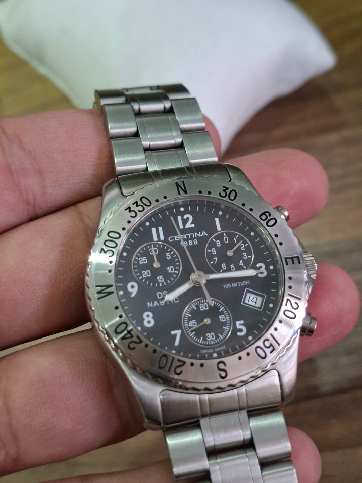 Certina markalı, gri metal kayışlı, kronograf özellikli ve tarih göstergeli erkek kol saati. İş ortamları için uygundur. ⌚