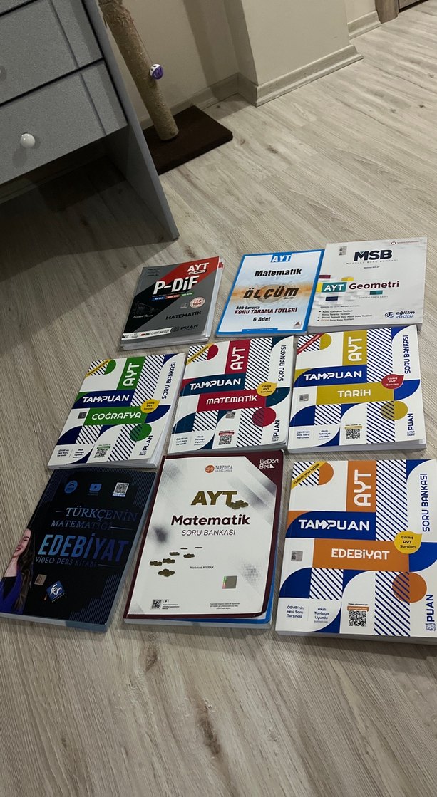 Matematik, geometri, edebiyat, tarih ve coğrafya konularını içeren çeşitli AYT soru bankaları ve kaynak kitaplar. 345ayt mat yarısı çözülmüş,edebiyat türkçenin matematiği video ders kitabını baştan sona önemli yerler işaretlenmiş,ayt puan mat soru bankası az bişey çözülmüş gerisi sıfırdır.deneme ve 3 adım testler hediyedir