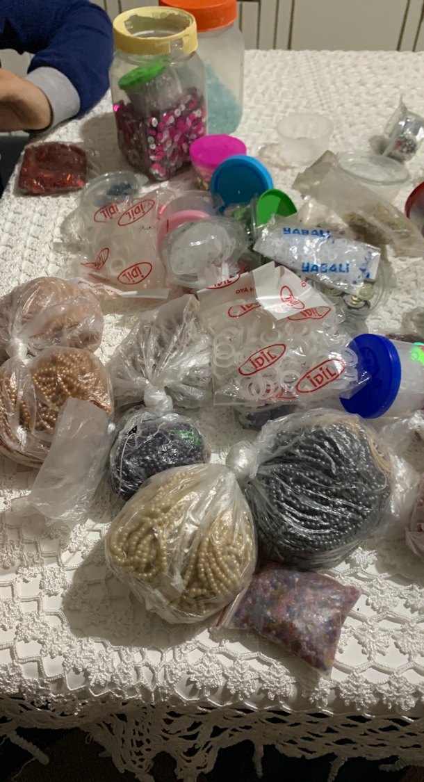 Farklı renk ve boyutlarda boncuklar ile takı yapım malzemeleri plastik poşet ve kaplarda yer alıyor.