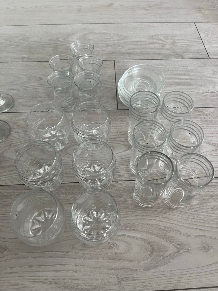 Farklı boylarda çeşitli şeffaf bardaklardan oluşan set. Bardaklar sade tasarıma sahip ve şeffaf malzemeden yapılmıştır. (Çay bardağı 1 tane eksik bi çay tabağının kenarı kırık)