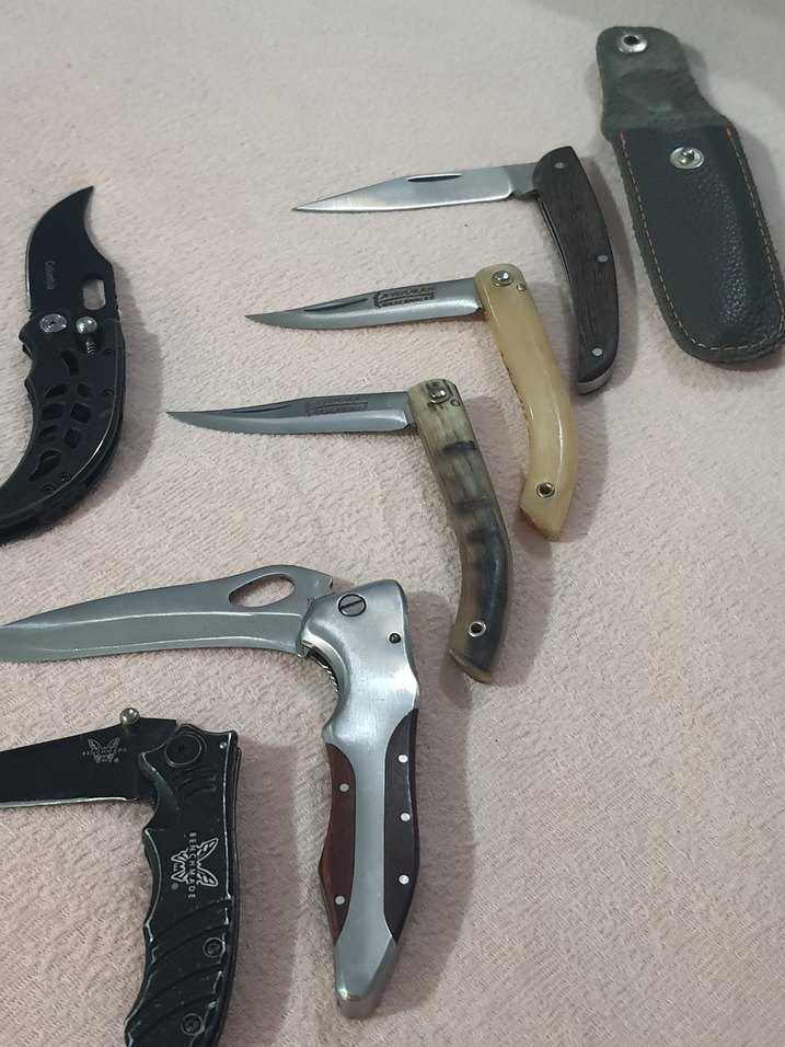 Farklı tarzlarda bıçaklara sahip, koyu ve gri saplı çeşitli katlanır cep bıçakları seti. Deri kılıf da dahildir. Surmene çakışıyor, geyik ve keçi boynuz ve kemik caki.