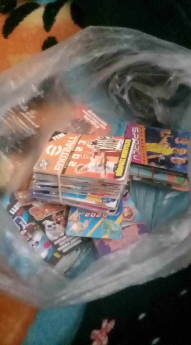 Spor ve eğlence temalı çeşitli çocuk kitapları ve dergileri lastikle bir arada.