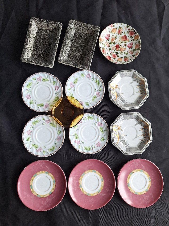 Çeşitli desenlerde porselen çay tabakları, koyu ve canlı pembe tonlarında, küçük tabak veya tatlı servisi için uygundur. ️