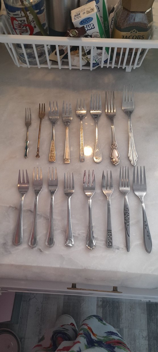 Farklı boy ve desenlerde, gümüş tonlarda karışık tatlı çatallar. Toplam satılıyor.