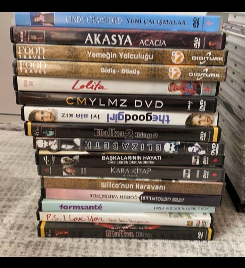 Cindy Crawford Yeni Çalışmalar, Akasya Acacia, Yemegin Yolculugu gibi çeşitli DVD ve CD başlıklarını içeren koleksiyon.