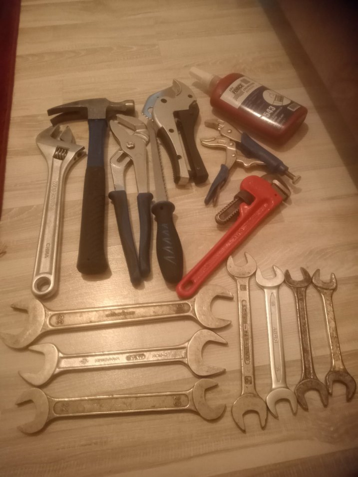 Ahşap yüzeyde düzenlenmiş çeşitli anahtarlar, pense, çekiç ve kırmızı boru anahtarı içeren el aletleri seti ️.