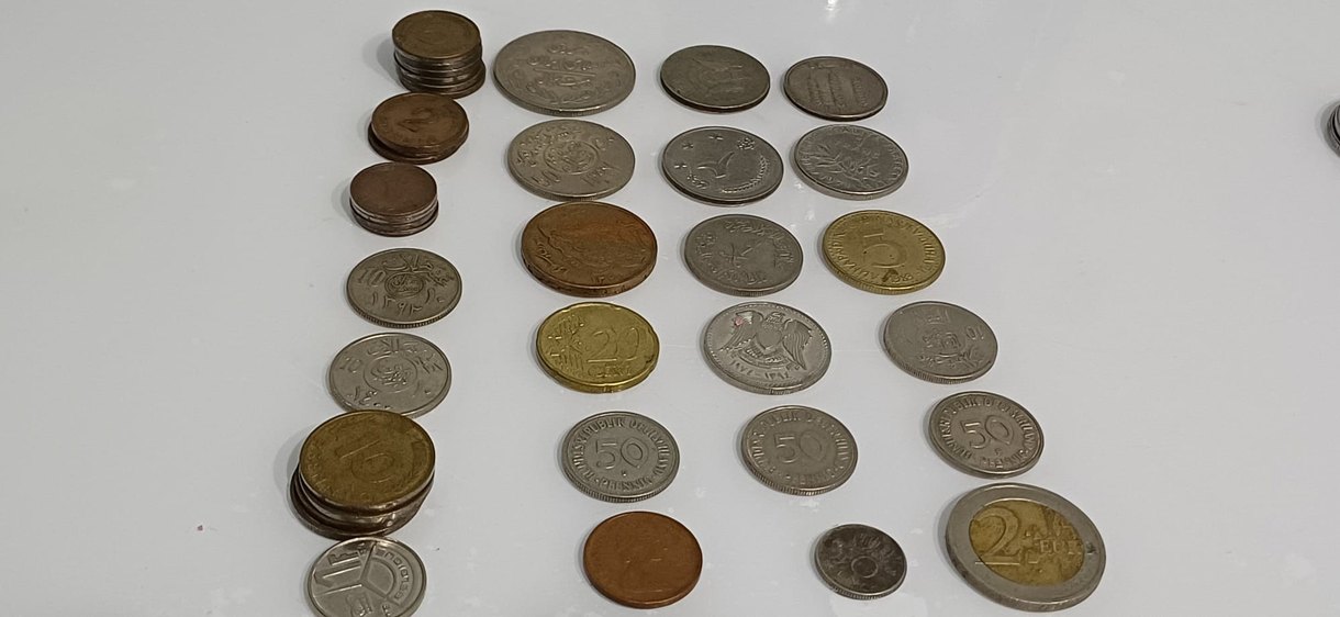 Farklı boyut ve renklerde, gümüş, kahverengi ve altın tonlarında çeşitli eski madeni paralar koleksiyonu. Bazılarında 50 değeri görülmektedir.