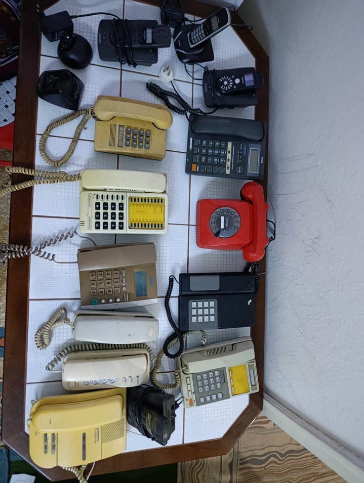 Farklı renk ve tasarımlarda çeşitli eski sabit ve kablosuz telefon modellerinden oluşan bir koleksiyon. Döner ve tuşlu modeller mevcuttur.