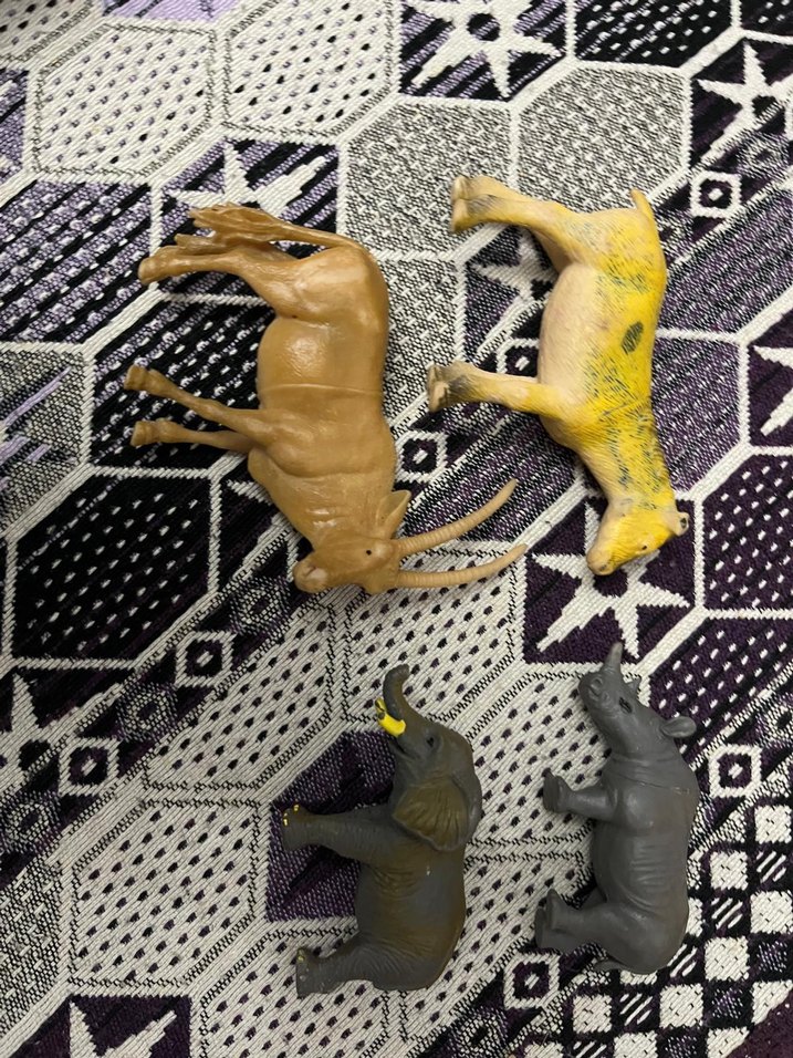 Kahverengi antilop, sarı çita, koyu fil ve gri gergedan figürlerinden oluşan dört parçalı hayvan figür seti.