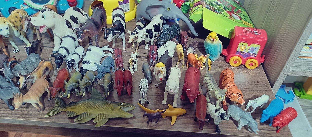 Farklı renklerde fil, inek, köpekbalığı ve diğer hayvan figürlerinden oluşan set, ahşap yüzey üzerinde sergilenmiştir. yaklaşık 60 adet büyüklü küçüklü hayvanlar minik boy yoktur 10 adet içi boş olarak 50 adet kaliteli içi dolu hayvanlardır adet olarak küçük 50 orta boy 85 büyük boylar 100 liradır