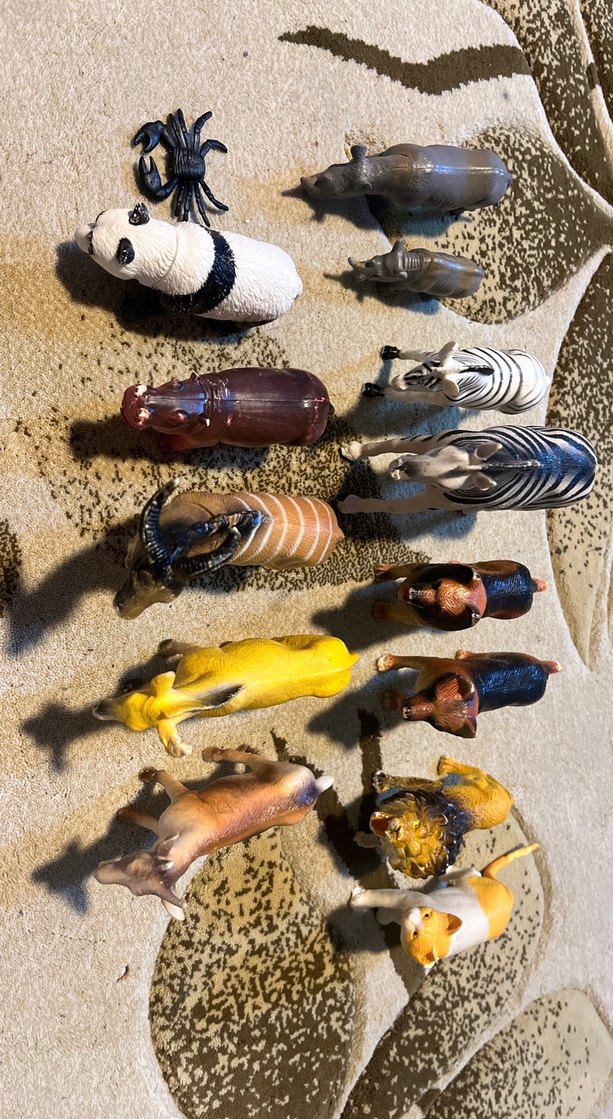 Koyu ve canlı tonlarda panda, zebra, aslan ve diğer hayvan figürlerinden oluşan çok renkli bir set. Kardeşim artık oynamıyor kendi harçlığını çıkarmak istediği için satışa koyduk