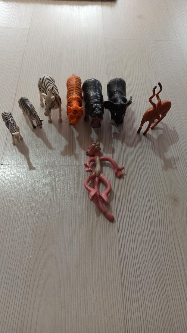 Zebra, kaplan, su aygırı ve daha fazlasını içeren detaylı, çok renkli hayvan figürleri seti.