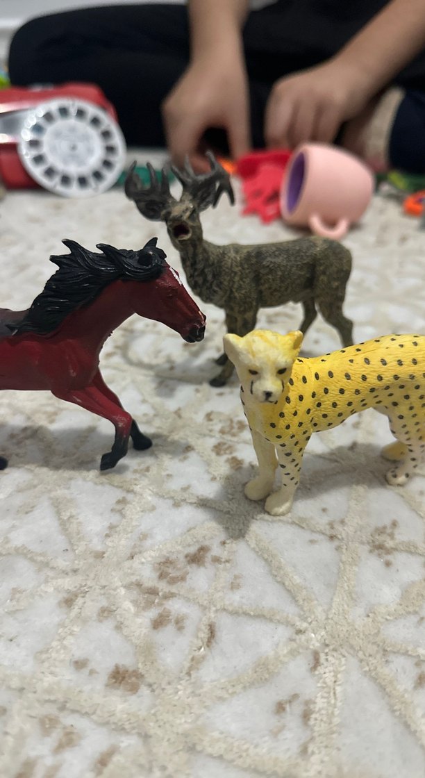 Dayanıklı malzemeden yapılmış, ayrıntılı çok renkli at, geyik ve çita figürleri seti.