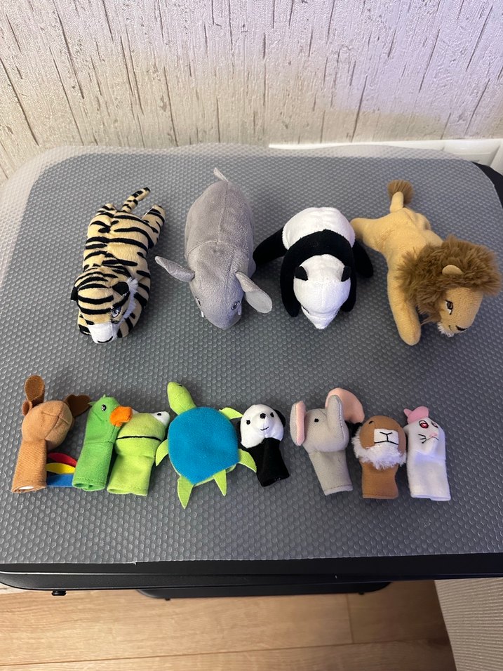 Kaplan, yunus, panda, aslan gibi hayvan figürlü yumuşak peluş oyuncaklar ve renkli parmak kuklaları seti. Az kullanıldı temiz