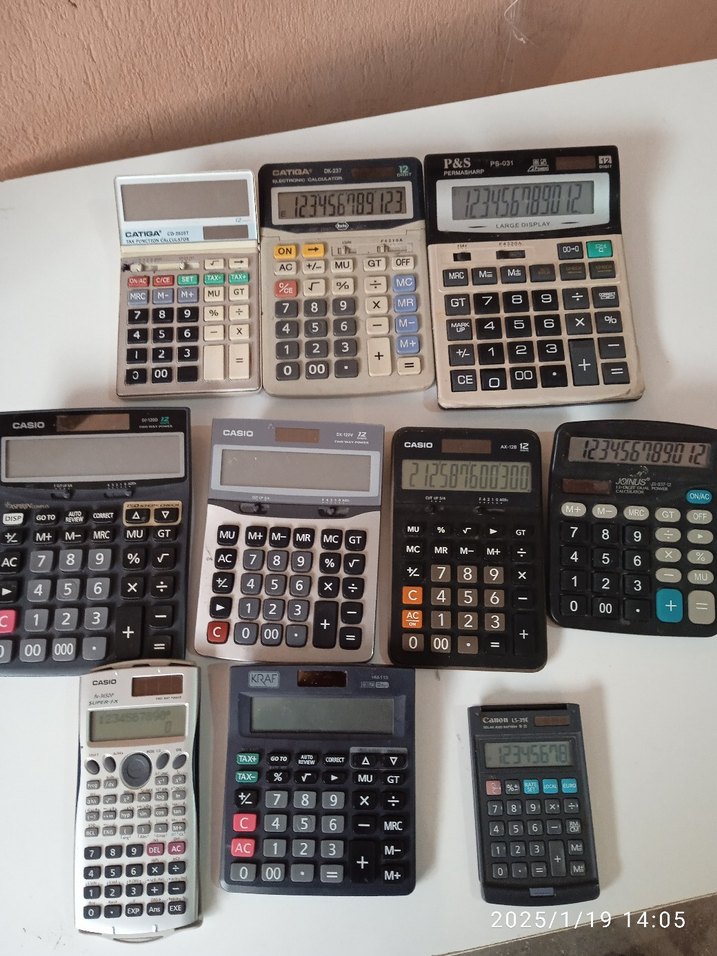 Farklı tuş düzenleri ve ekranlara sahip beyaz ve siyah çeşitli hesap makineleri koleksiyonu, bazıları güneş paneli içerir.