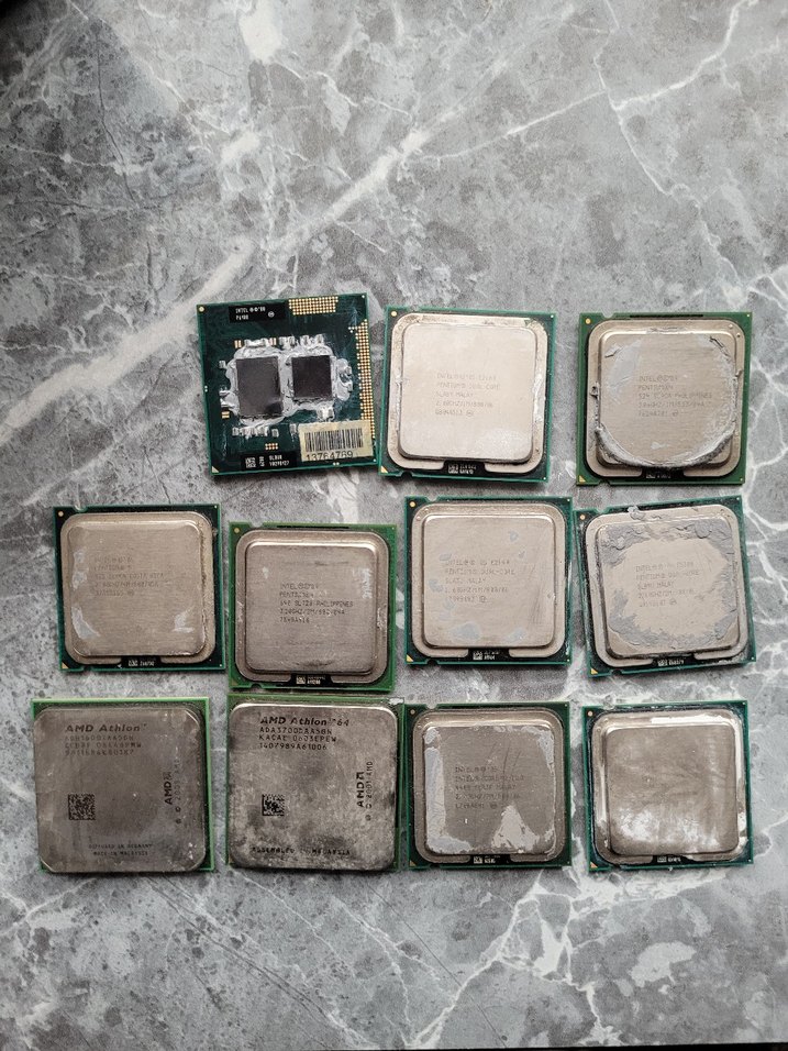 Farklı modellerde ve koşullarda gri ve altın tonlarında çeşitli bilgisayar işlemcileri. Bilgisayar bileşenleri koleksiyonu veya tamiri için uygun. Hepsi çalışır durumda fiyat son pazarlık teklif etmeyin