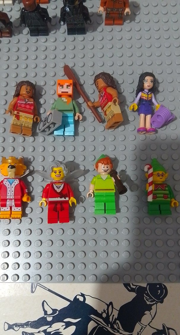Altı renkli Lego minifigürü, gri taban plakası üzerinde çeşitli karakterler ve aksesuarlarla birlikte.