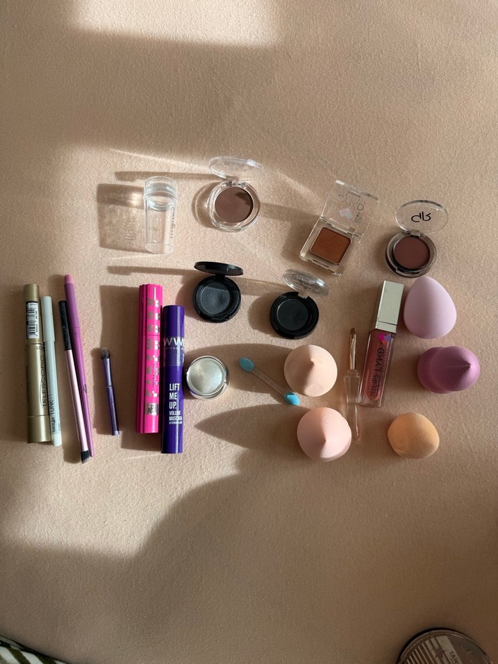 Açık bej tonlarında çeşitli eyeliner, maskara, far, lipgloss ve makyaj süngerlerinden oluşan makyaj seti bazıları hiç kullanılmadı iade yoktur