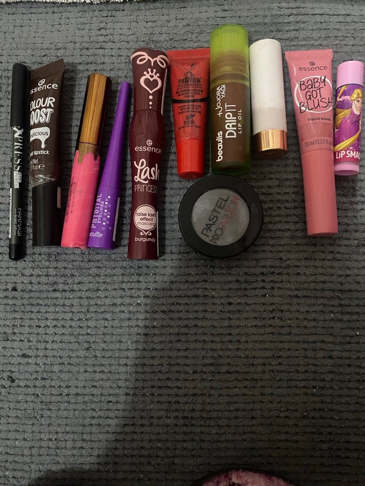 Essence ve Pastel gibi markalara ait canlı koyu pembe ve farklı tonlarda ruj, maskara, allık ve far içeren makyaj ürünleri seti.