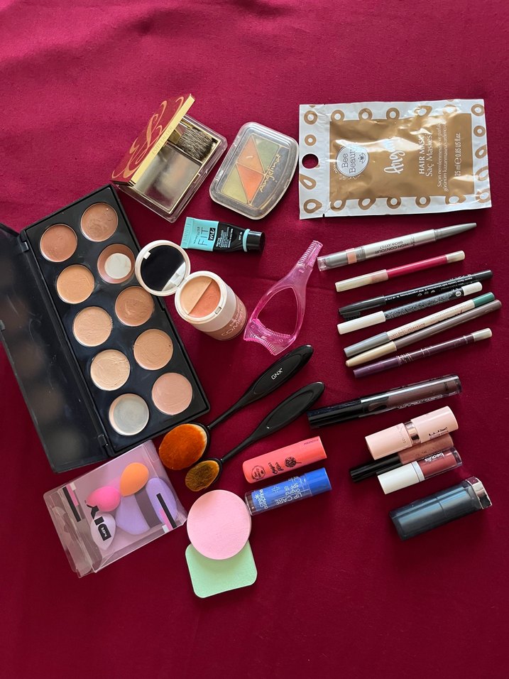 Kontür paleti, rujlar, eyelinerlar, makyaj fırçaları ve saç maskesi içeren çeşitli makyaj ürünleri. Az Kullanilmiş Çok Renkli Toplu makyaj ürünleri, toplam fiyattir. Çok uyguna koydugum için teklife agik degildir. Bazilarinda az bazilari dolu. Estalauder allik kabi bostur, kullanmak isteyen olursa diye ekledim. Ruj boylarini göstermeye çalistim Coco she kontür seti sadece kendime uygun olanlari kullandim, kalanlarin üstünü pecete ile temizledim. Makyaj bazi ve kas kalemi üstündeki far cok az kaldi, güzel olduklari icin koydum. Fondoten yaridan az , üstünde allik ve gözalti kismi cok az kullanildi. Beaulis lipstick hic kullanilmadi. Rime sürme aparati hem kas da tariyor. Kas göz dudak kalemleri karisik. Makyaj Fondoten pudra süngerleri ve fircalari sifirdir. Hic kullanilmadi.