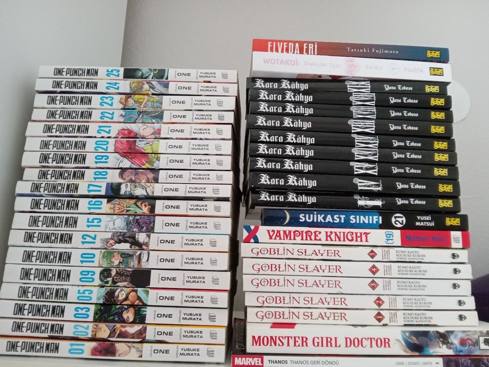 Goblin Slayer, Monster Girl Doctor, Vampire Knight ve Marvel Thanos gibi başlıkları içeren manga ve çizgi roman koleksiyonu. sararmalar vardır.
