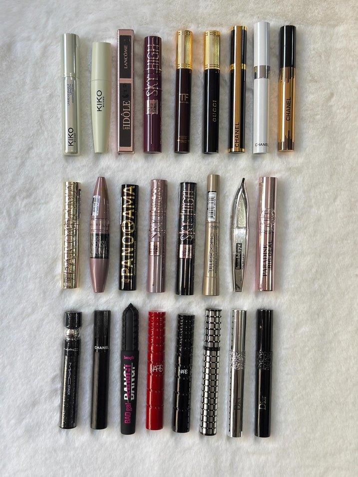 Farklı markalara ait çeşitli maskaralar, koyu ve beyaz kutularda, göz makyajı için farklı seçenekler sunar. istediğiniz markayı söyleyiniz