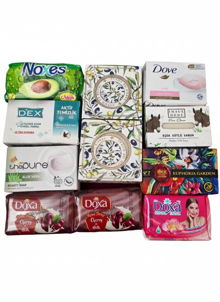 Dove, Doxa, Noxes gibi markaların farklı kokularda ve nemlendirici özellikli sabunları içeren paket.