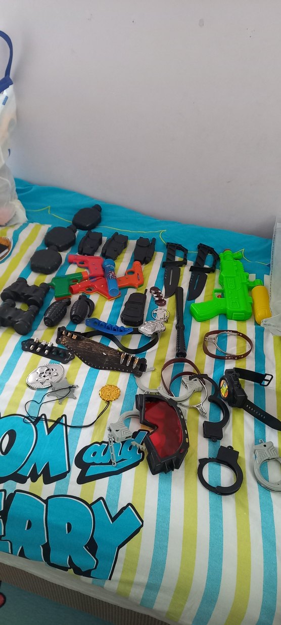 Renkli plastikten yapılmış, tokalı kemerler, oyuncak silahlar, kelepçeler ve diğer oyun aksesuarlarını içerir. Çok renkli ve desensiz.