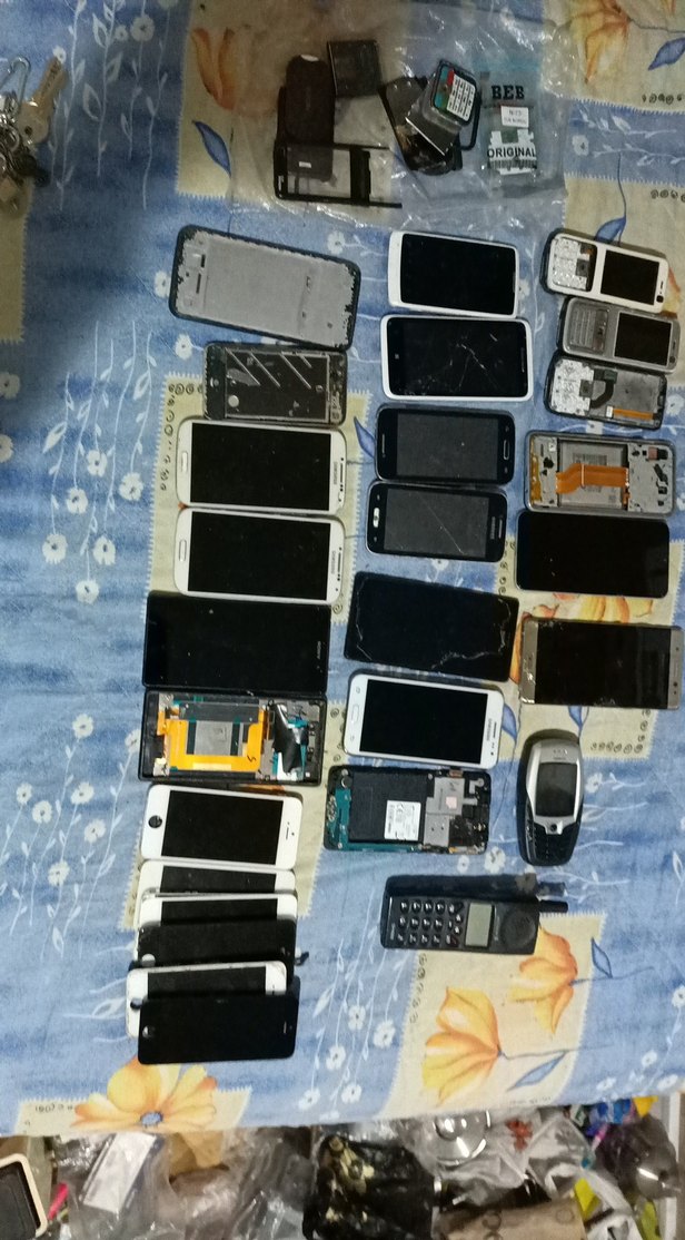 Farklı modellerde, karışık parçalı koyu ve gri renk Android telefonlar. Bazılarında ekran hasarı ve sökülmüş parçalar var.