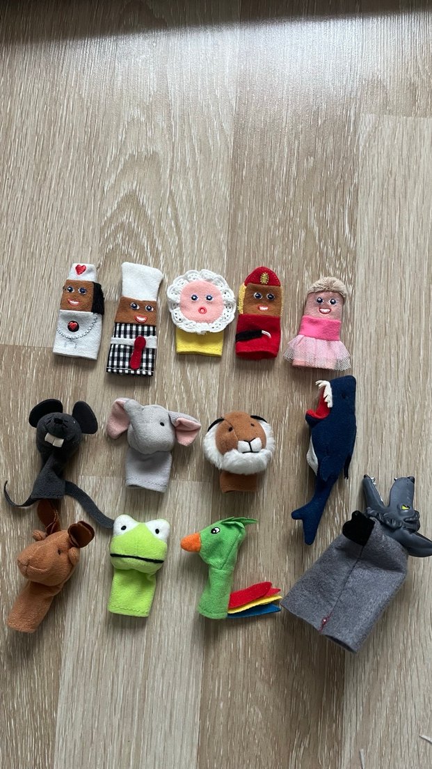 Çeşitli renk ve tasarımlarda, yumuşak malzemelerden yapılmış hayvan ve karakter parmak kuklaları seti.