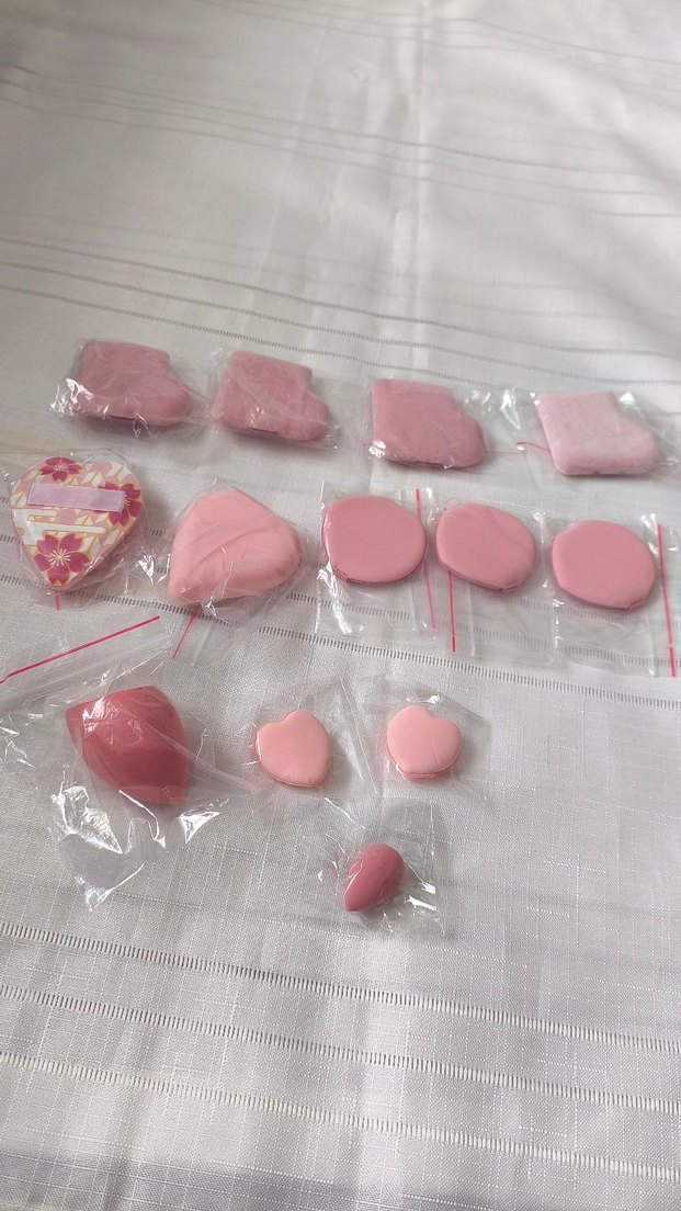 Pastel pembe tonlarda, farklı şekil ve boyutlarda çeşitli makyaj süngerleri seti, hijyenik olacak şekilde ayrı paketlerde.
