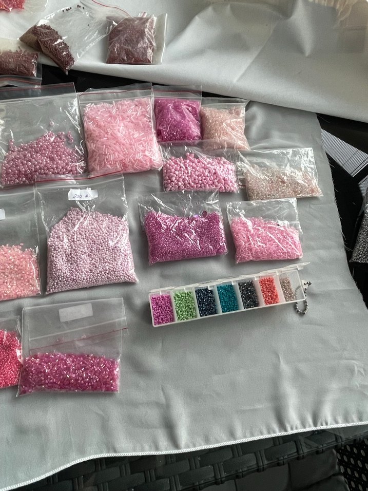 Çeşitli pembe ve renkli tonlarda boncuklar içeren el işi ve takı yapımına uygun boncuk seti.