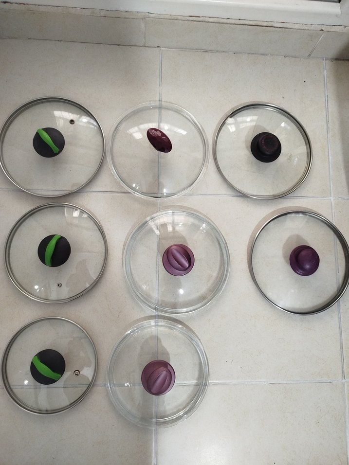 Farklı boylarda, gri, yeşil ve mor renkli saplı cam tencere kapakları seti. lütfen almak istediğiniz kapak boyutu mevcut mu sormadan almayın fiyatı adet fiyatıdır