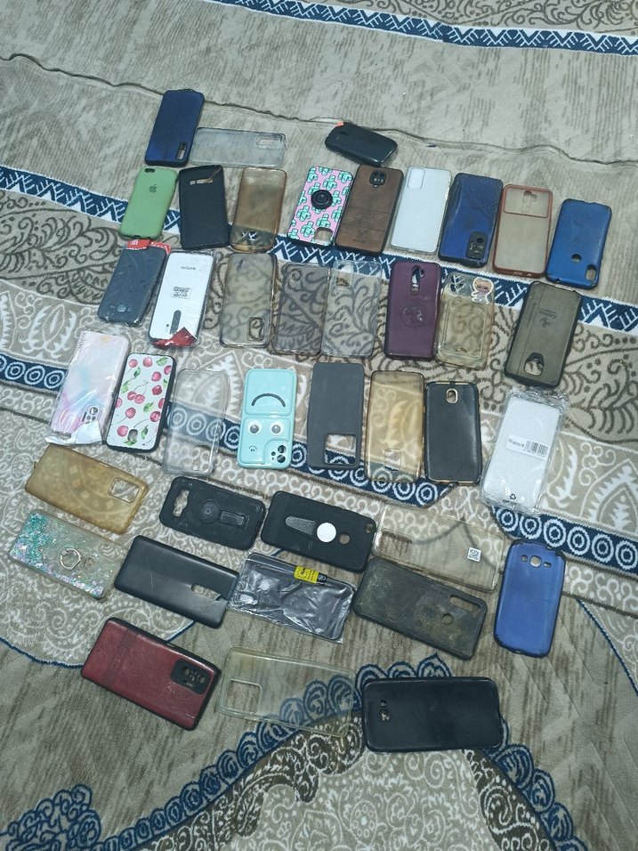 Farklı telefon modellerine uygun, çeşitli koyu ve çok renkli, tokalı tasarımların da bulunduğu çoklu telefon kılıfları koleksiyonu.hepsi satılık 50 adet elimde var