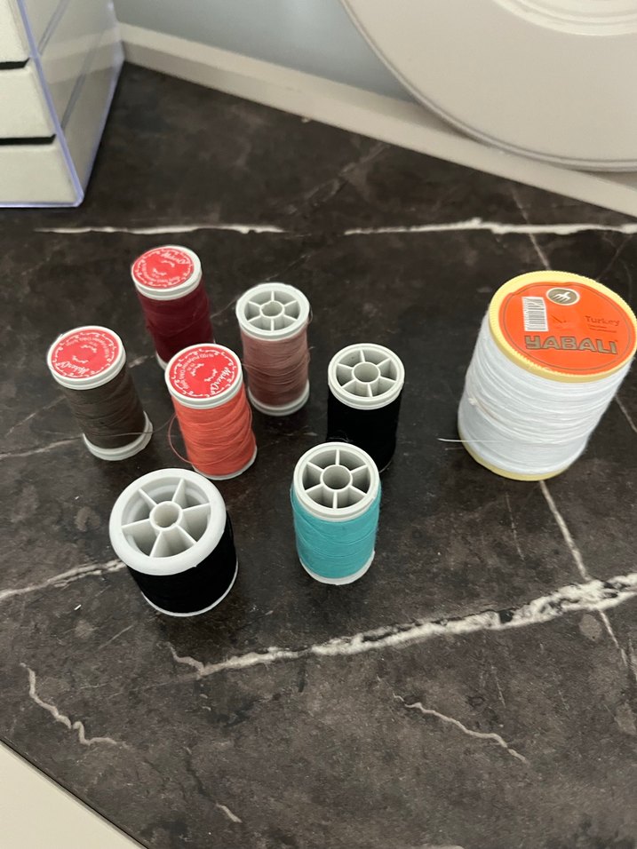 Farklı renklerde dikiş iplikleri seti, siyah, kırmızı, turuncu ve turkuaz renk seçenekleriyle. Bir makara üzerinde HABAL etiketi bulunmaktadır.