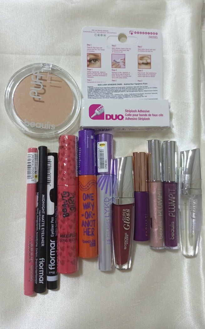 Canlı gri ve pembe tonlarda farklı markalara ait dudak parlatıcıları ve kalemlerden oluşan makyaj seti. fiyat sorunuz