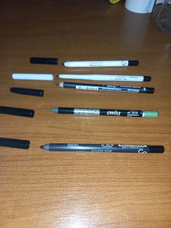 Beyaz ve koyu tonlarda, kapaklı çeşitli göz kalemleri ✏️